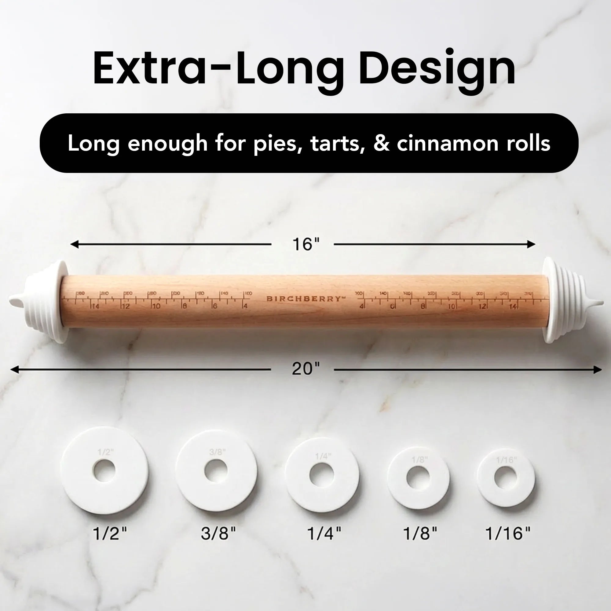 Each disc adjusts the rolling pin to a specific dough thickness. Swap discs in seconds to get consistent dough every time. We have five sizes: 1/16”, 1/8”, 1/4”, 3/8”, and 1/2”. No additional tools needed—just twist off the end, snap on a new disc, and you’re ready to roll.